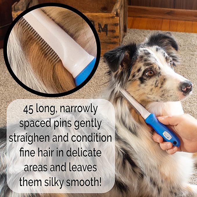 • Long and short pins allow combing of top coat and undercoat to detangle fur and prevent matting.