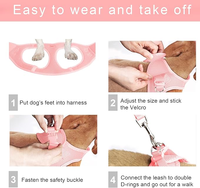 • 【Easy to Wear】The step-in design is easy to put on and off, just adjust the harness, affix the velcro to fit your dogs, fasten the buckle, then connect the leash and ready to walk.