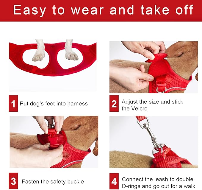 • 【Easy to Wear】The step-in design is easy to put on and off, just adjust the harness, affix the velcro to fit your dogs, fasten the buckle, then connect the leash and ready to walk.