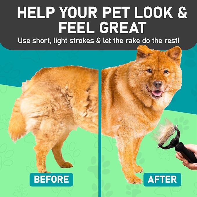 • EFFECTIVE DESHEDDING TOOL: Our dematting and deshedding tool gently removes loose hair and eliminates tangles, knots, dander, and trapped dirt. The perfect cat brush or dog grooming brush solution for pets with thick fur or dense double coats.