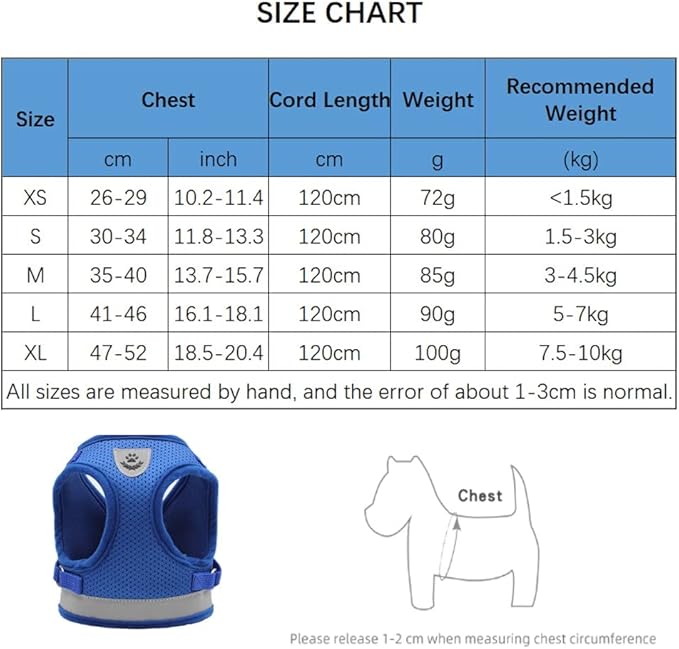 • ★Size XS: Chest girth 10.2” – 11.4”, Cord length 120cm/47.24”. Fit for cat, tiny small dogs weight about 1-1.5kg/ 1-3lbs. Please measure your dog/cat carefully and refer to the size chart before order