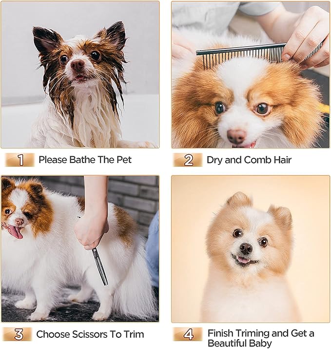 • 【6 in 1 Dog Grooming Scissors Set】The dog grooming scissors set comes with 2 straight scissors, 1 thinning scissor, 1 curved scissor, 1 grooming comb and 1 storage case