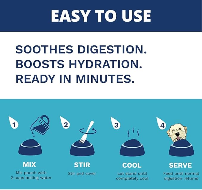 • NO MORE COOKING - JUST ADD WATER! When dogs experience digestive upset, including vomiting and diarrhea, vets recommend feeding a “bland diet” to soothe the digestive tract until normal digestion is restored.