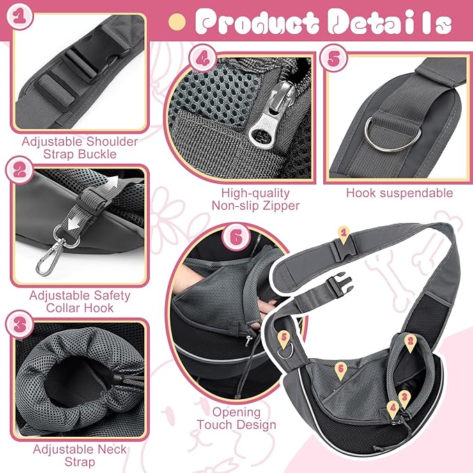 • Material and Details Upgrade: The mesh material and leather material have been updated to make the dog satchel carrier more advanced. The adjustable rope has been reinforced and is not easy to break. At the same time, a D buckle is added, which can be used to hang garbage bags or fold dog bowls or keychains. There are more details to upgrade waiting for your discovery.