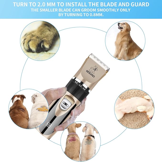 • Long Lasting Battery & LED Indication: USB charging design .2200mA High Capacity Li-ion Battery, charging for 3 hours and can sustain use of 250 minutes.With LCD display,for reminding using and charging status,helping you better control the grooming work.Rechargeable design of this dog clipper, you don't have to buy replace batteries. Long-term use does not cause wrist pressure or pain