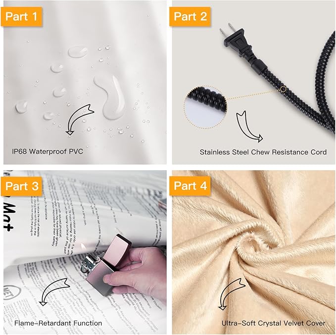 • ❤【Safety and Secure Structure】7-layer protective structure with UL-certified heating wire protect pets from burns. Soft PVC envelope with waterproof and flame-retardant function. Built-in intelligent temperature sensor in the heating pad to prevent overheating to protect pets. Don’t let your pets lay on the pet heating pad without a plush cover.