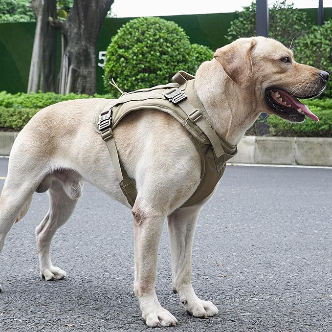 • [Full Metal Buckle ] This tactical dog harness uses 4 x high-quality metal buckles, durable, waterproof and prevents rust.It can effectively prevent dogs from escaping from the vest, suitable for outdoor training, work, hunting and play.