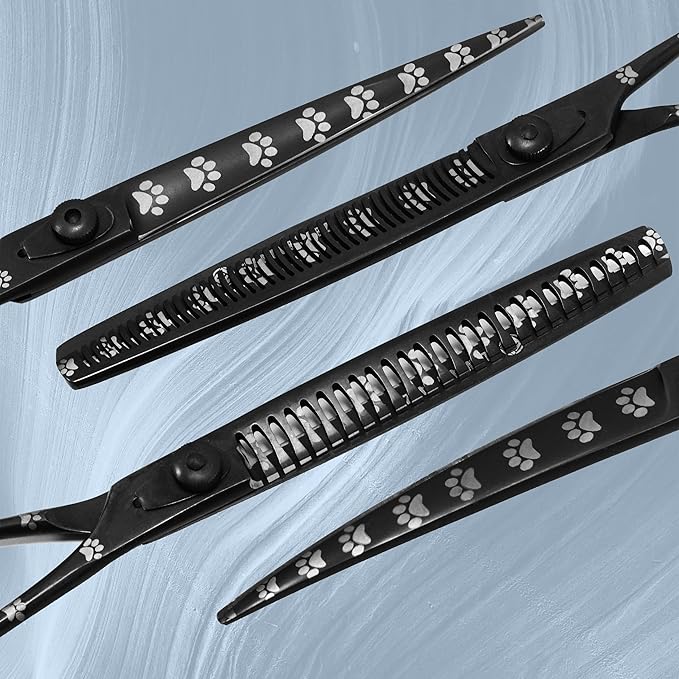 • Flamia & Jabz Professional 8" Pet Grooming Scissors Set with Straight, Curved, Thinner / Blenders & Chunker Shears with Paw Prints, made of High Quality Stainless Steel