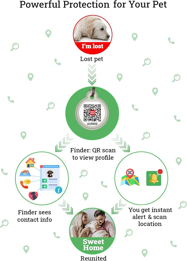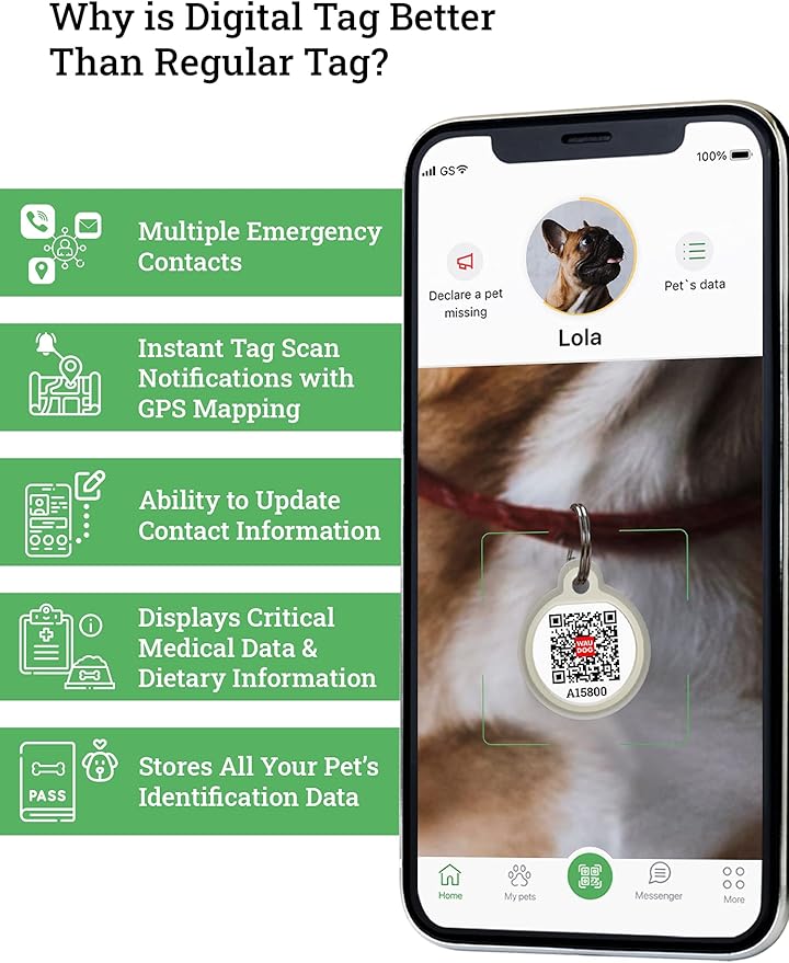 • Modern Digital Solution - QR dog tag simplifies process of finding owner. You can link dog id tag to mobile app, add multiple contacts & change them at any time. Adding dietary & health info will help the finder to take care of your pet.