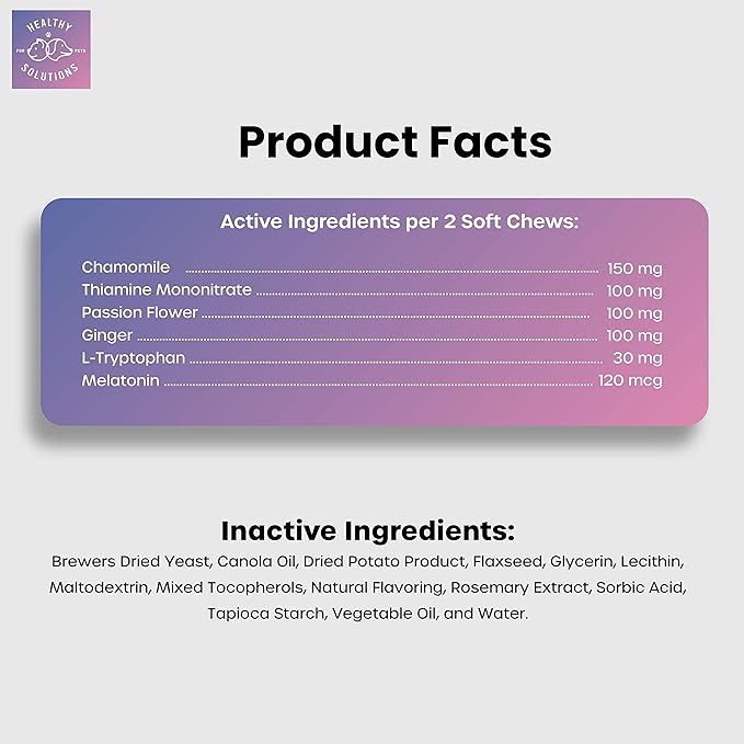 • ๐Ÿ—ธ VETERINARIAN FORMULATED -- with Melatonin, Chamomile, Passion Flower, Thiamine, L-Tryptophan, and Ginger to help soothe sensitive stomaches.