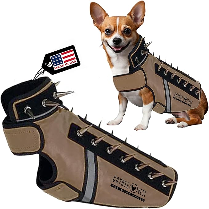 CoyoteVest SpikeVest Dog Harness Vest for Small Dogs, Reflective Dog Vest with Spikes to Shield Your pet from Coyotes, Raptor and Animal Attacks, Anti Hawk Vest, Made in USA (XXS-Texas Tan)
