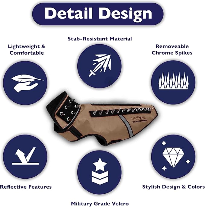 • NECK AND BODY PROTECTION: SpikeVest includes a vest with removable chrome spikes; Neck spikes and 2 strips of spikes for the back. Made with super tough puncture resistant Cordura fabric that's stab-resistant to withstand the sharp canine teeth of coyotes and aggressive dogs.