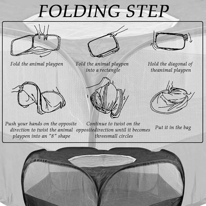 • 【Automatic Open and No Tools Required】The portable yard fence for small animals is simple assembly, built in frame pops open in seconds. Folds back flat when not in use for easy carrying and storing. Its mesh windows, mesh sides provide just the right amount of light, shade and ventilation. [Tips: Item under spring pressure, keep item away from children and face when opening!]