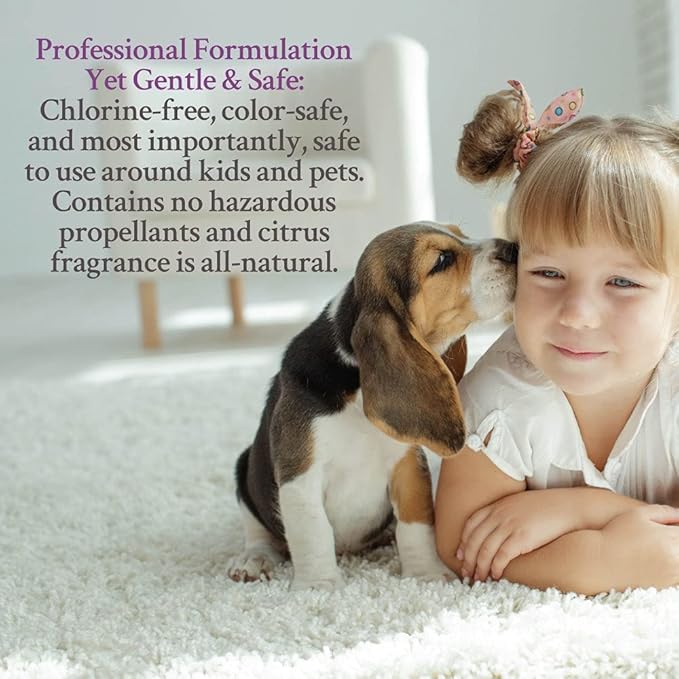• Professional Formulation Yet Gentle & Safe: Chlorine-free, color-safe, and most importantly, safe to use around kids and pets. Contains no hazardous propellants and citrus fragrance is all-natural.