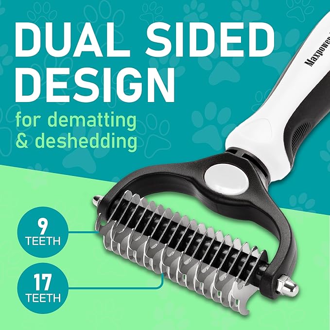 • DUAL-SIDED DESIGN: Our grooming brush is perfect for dematting and deshedding your pet's coat! With a dual-sided design, use the 9-teeth side to tackle stubborn mats and tangles and the 17-teeth side to thin out and deshed your pet's fur.