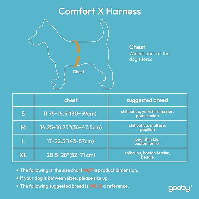 • No Choke Dog Harnesses for Small Dogs – Gooby’s Comfort X Harness is made for small breed dogs. This means that our largest size will fit a dog up to 30 lbs. In order to fully utilize the functionality of the harness, as well as the fit, we recommend measuring the largest part of the dog’s chest and follow the chest sizing. For reference, estimated sizing by weight is Small: 5-9 lbs Medium: 9-15 lbs Large: 15-20 lbs X-Large: 20-30 lbs.