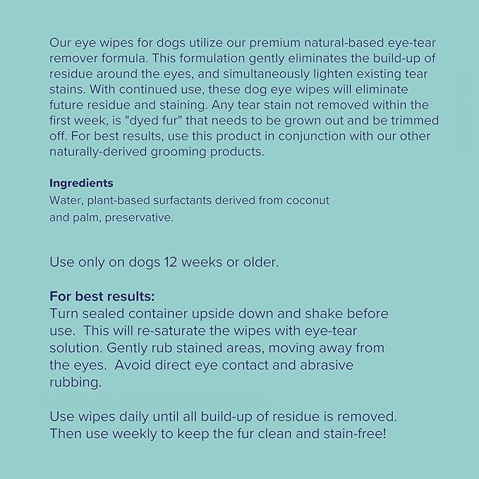 • EASY TO USE - Pre-soaked wipes that require no rinsing so you can use them anywhere, at anytime - at home, in the car, in the office, on the go. Our gentle and effective formula allows for daily use for dogs of all ages: puppies, adult and senior. Designed to help any breed but especially effective for white coated breeds and dogs susceptible to tear stains: Shih Tzu, Pekingese, Maltese, Pugs, Cocker Spaniels, Poodles.