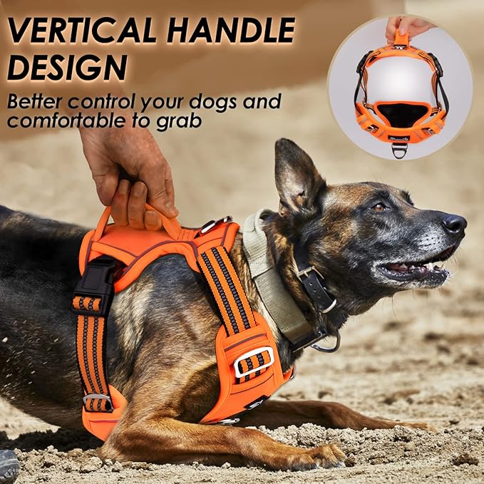 • 【VERTICAL HANDLE OFFER MORE EVEN STRESS】--- Forced on three sides design help to evenly distribute pulling pressure into three parts of the body to prevent choking. The design of heavy duty dog harness would be more easy to control our dogs.