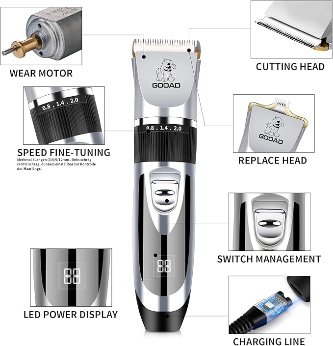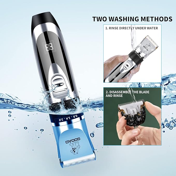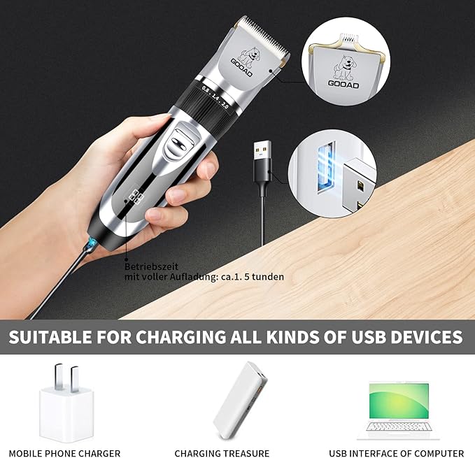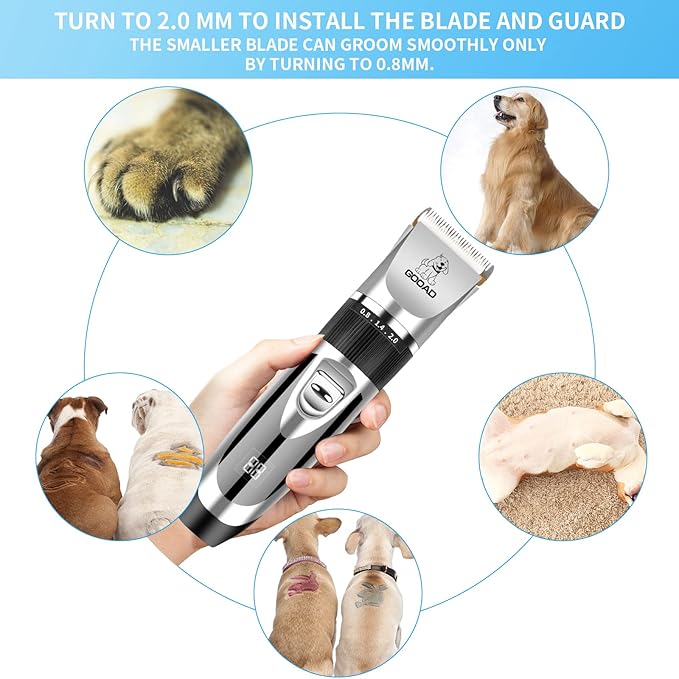 • Long Lasting Battery & LED Indication: USB charging design .2200mA High Capacity Li-ion Battery, charging for 3 hours and can sustain use of 250 minutes.With LCD display,for reminding using and charging status,helping you better control the grooming work.Rechargeable design of this dog clipper, you don't have to buy replace batteries. Long-term use does not cause wrist pressure or pain