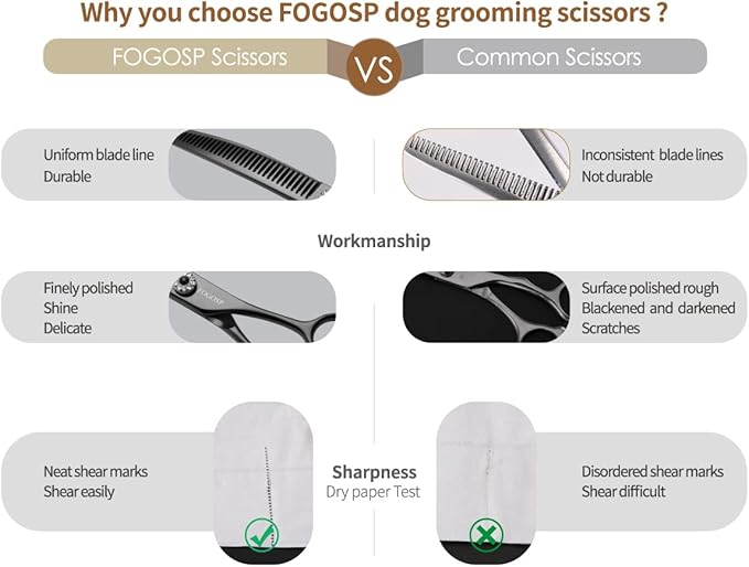 • 🐶[Multipurpose Dog Grooming Shears] FOGOSP curved chunker shears is designed for the trimming,thinning,styling and shaping. It is easy and fast to thinning your pet hair, and it easier to use when styling and shaping towards the end of the groom. They leave a smoother and fluffy outline, and save time versus trying to achieve curves only using straight scissors or curved scissors . It will exceed your expectation to create pretty and sophisticated pet hair style.