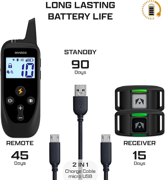 • 24/7 Customer Service & 1-Year Warranty: Rechargeable dog training collar with remote- lasts up to 45 days & the Receiver collar with up to 15 days operation per single charge