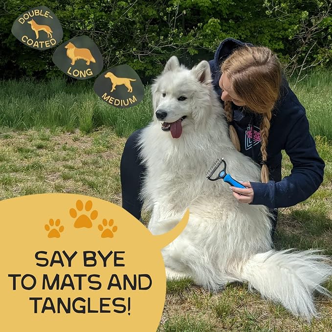 Pret & Lively 2 in 1 Pet Hair Dematting Tool, Tough Mats and Tangles, Undercoat Rake Comb, Dogs, Cats, Rabbits, Hairy Pets, Holiday Gift, Professional Grooming Brush For Deshedding, Extra Wide (Blue)