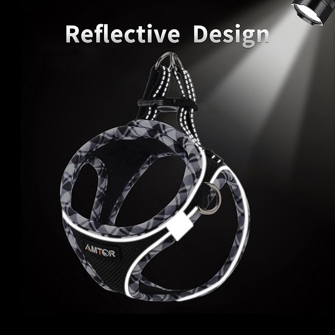 • Reflective dog harness - AMTOR small dog harness with Magic Tape,buckle and double D-rings work together protect your pet in three layers of security. The 360° highly reflective strips provide good visibility in the dark