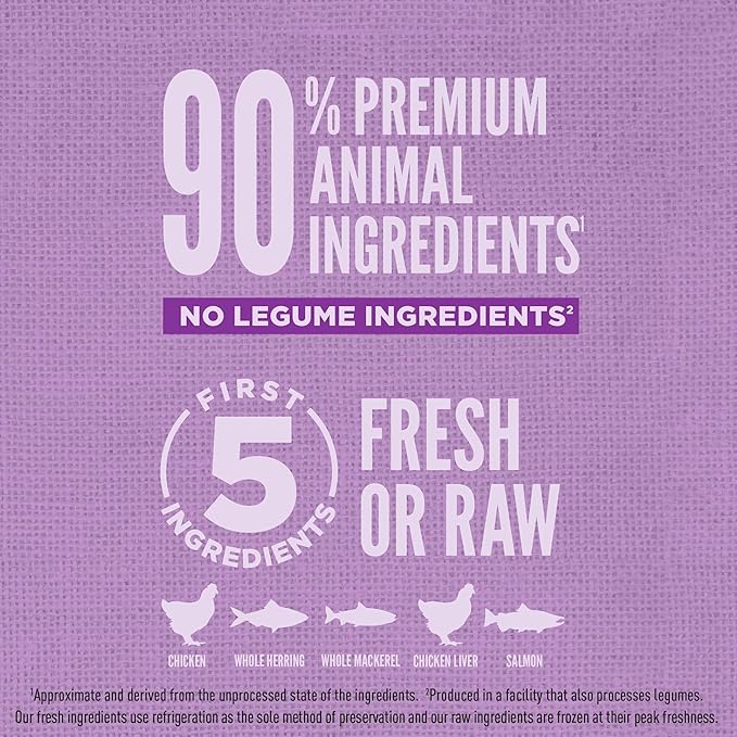 • The first five ingredients are fresh or raw chicken, whole herring, whole mackerel, chicken liver and salmon with protein, vitamins and minerals
