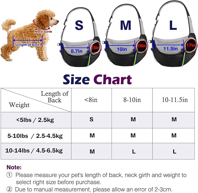 - Multi-size and Wide Application: Our dog crossbody satchels are available in three sizes and in a variety of colors. Please measure your pet's length of back, neck girth and weight according to the size chart in the third picture to choose the right size before purchase. The hand-free design make it perfect for everyday use such as shopping, biking, traveling and mountain climbing. Let your dog be by your side at all times!