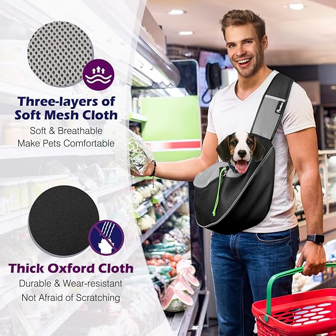 - Safety: Made of oxford cloth and air mesh, this pet sling carrier is stretchy and provides cushioning protection for your pet. The drawstring prevents the dog from accidentally opening the zipper, while also preventing him from chewing the sling bag. Built-in safety collar hook, you can buckle it to the dog's collar or harness to prevent it from falling off.
