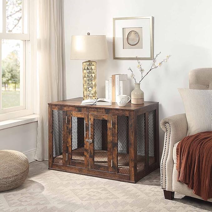 unipaws Furniture Dog Crate with Tray for Medium Dogs, Indoor Aesthetic Puppy Kennel Pet House Dog Cage with Door, Modern Decorative Wood Pretty Cute Fancy End Side Table Nightstand, Rustic
