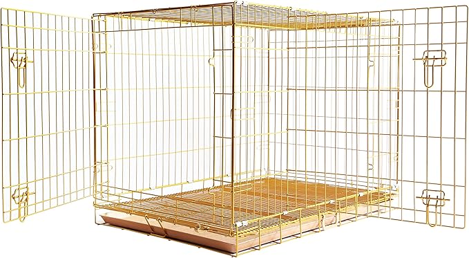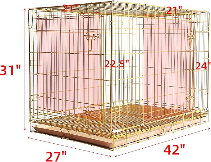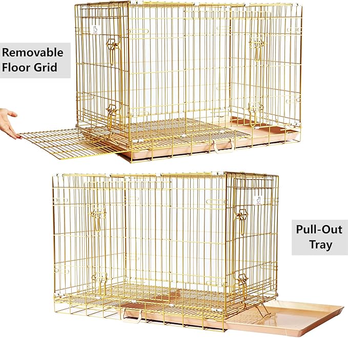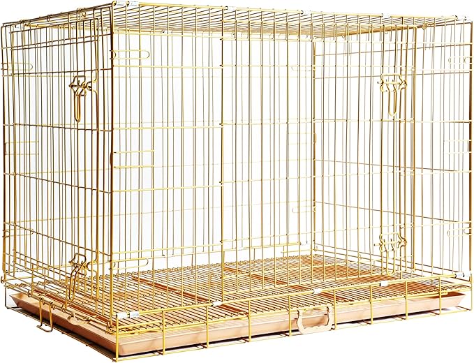 - Golden & Thickened Crate: Made of premium metal wire with a rose gold nano coating, this exclusive big dog cage extends its life and provides resistance against rust, fading, peeling, and scratches. Not easy to bend or bite. The comfortable, den-like space provides enough ventilation and visibility. Don't let your dog feel cooped up. Reduces cage anxiety and chewing in your dog