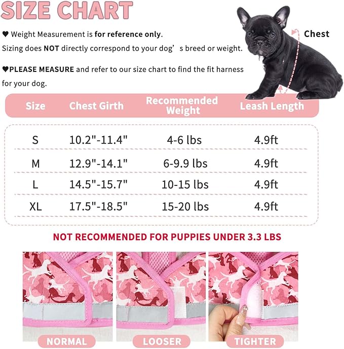 • Small Dog Harness: fits Chest girth 10.2-11.4in, weighing between 4-6 lb small dogs like French Bulldog, Maltese, Yorkshire, Chihuahua, etc. PLEASE MEASURE THE DOG before purchase to find the fit harness for your dog.
