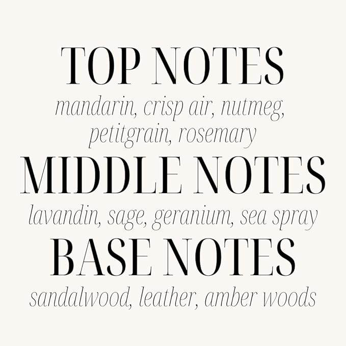 • Top notes: mandarin, nutmeg and rosemary, Middle notes: sage, geranium and sea spray, Base notes: leather, sandalwood and amber woods