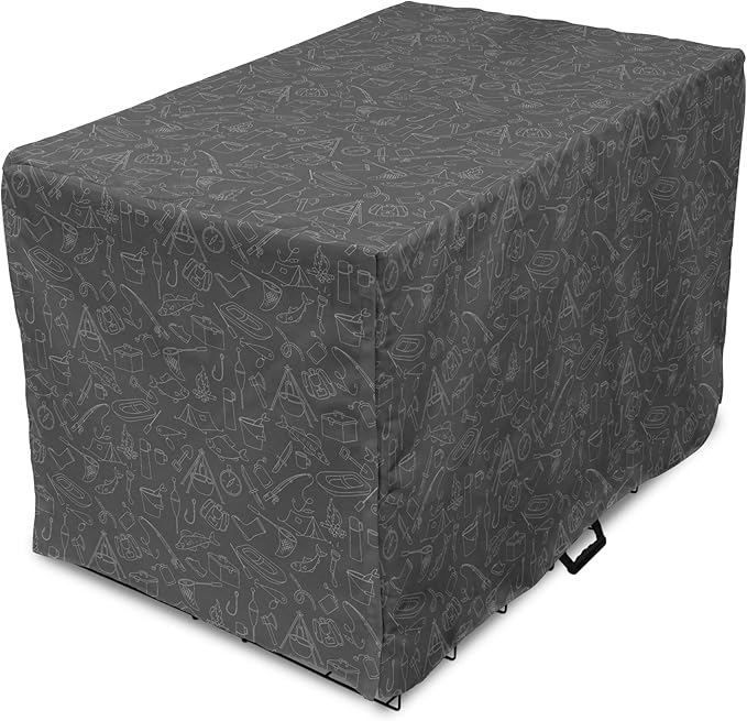 Ambesonne Fishing Theme Dog Crate Cover, Monochrome Illustration with Hand Drawing Angling and Camping Objects, Easy to Use Pet Kennel Cover for Cats & Medium Dogs, 24 Inch, White and Grey