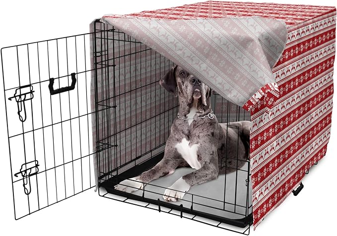 Ambesonne Christmas Dog Crate Cover, Xmas Winter Themed Deers Snowflakes in Nordic Pattern Borders and Lines Art, Easy to Use Pet Kennel Cover for Medium Large Dogs, 48 Inch, Ruby White