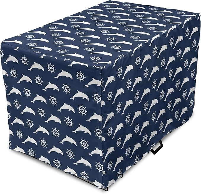 Lunarable Dolphin Dog Crate Cover, Maritime Pattern with Silhouettes of Dolphins and Steering Wheels in White Color, Easy to Use Pet Kennel Cover for Small Dogs Puppies Kittens, 22 Inch, Night Blue
