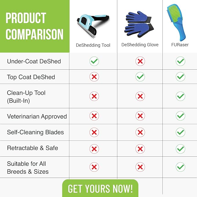 • FEATURES: The FURaser replaces more than 6 grooming tools in one and allows you to quickly and easily remove all loose fur and dander from your pet's under-coat and top-coat. De-shed your pets and and keeps your clothes fur free! It also turnsde-shedding into a luxurious massage that will make your fur-friend happier than ever. FURaser is 50% more effective at de-shedding compared to other products on the market. Reduce shedding up to 99%.