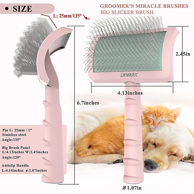 • 【Extra Long Pin Slicker Brush Get Tangles Out From Rough and Long Thick Curly Coat.】- Our Pet slicker brush has unique design longer,denser and softer stainless steel pins penetrate deep into the coat with 25mm total 180+ needles. Each steel tooth angle of 135 degree more fit to the contact area of pet hair,not deform,not harm skin,no electrostatic hair.This slicker brush for dogs and cats safe and effective without tugging or pulling hair,or scratching better for a relaxing massage.
