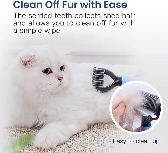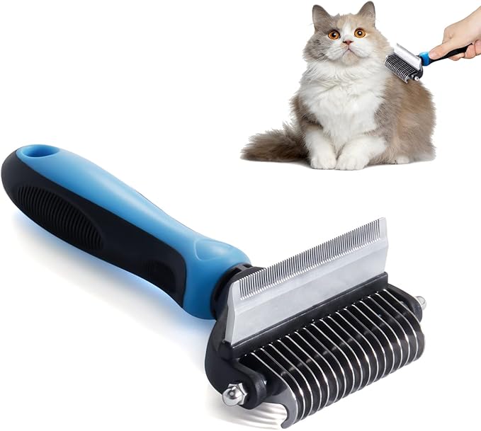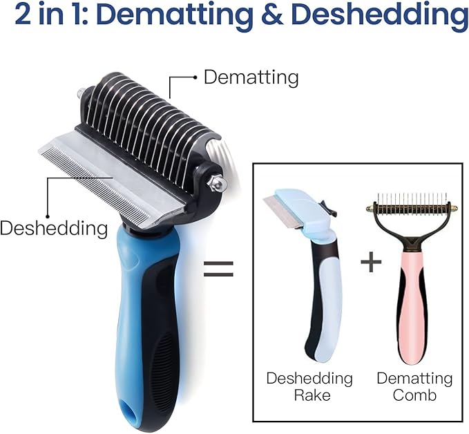 • 2 in 1 Pet Grooming Brush: Are you plagued by the unsightly fur all over your house, beds or car, and tangles of your pet’s fur? No worries about those issues with our expert 2-in-1 versatile dog cat grooming comb. The thicker teeth effectively remove tangles while the thinner teeth reduce dead or loose hair by up to 95%. With our dog cat de shedding tool, you can save time and money on visits with your veterinarian or pet groomer!