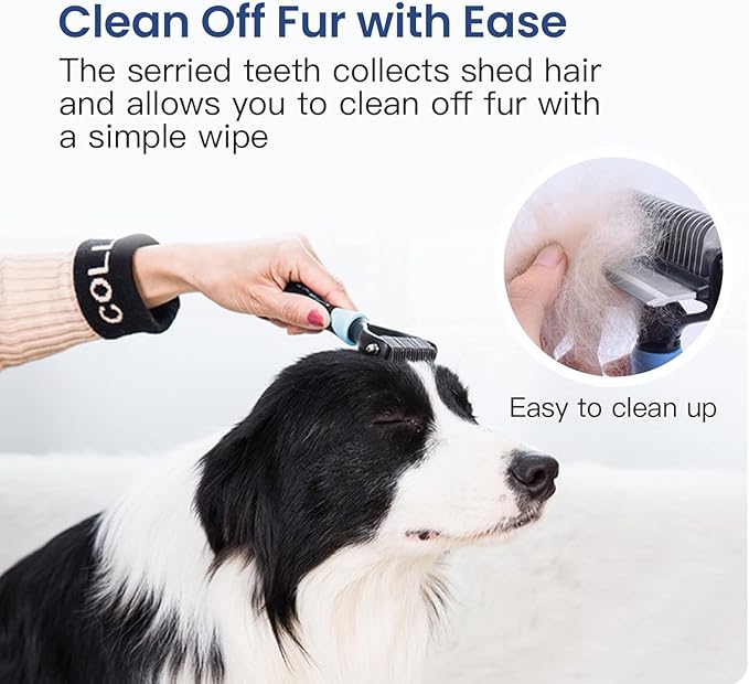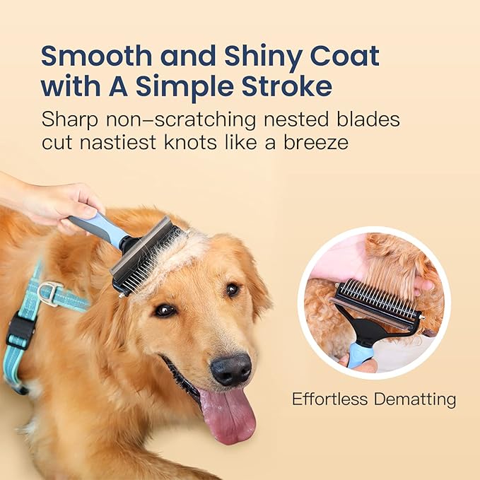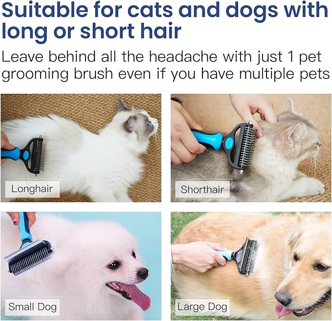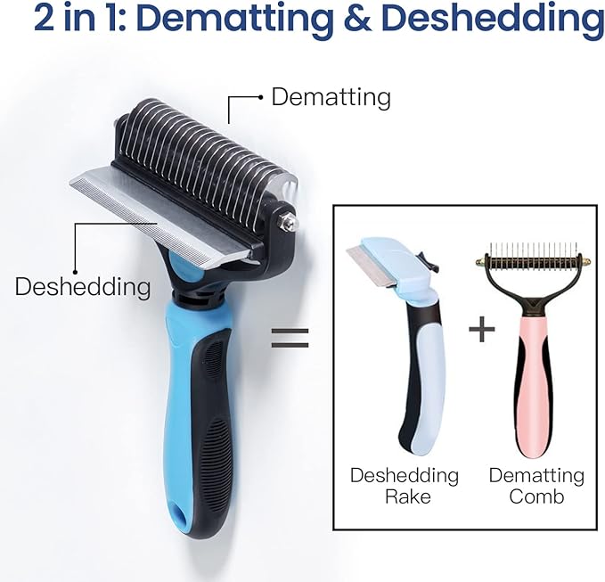 • 2 in 1 Pet Grooming Brush: Are you plagued by the unsightly fur all over your house, beds or car, and tangles of your pet’s fur? No worries about those issues with our expert 2-in-1 versatile dog cat grooming comb. The thicker teeth effectively remove tangles while the thinner teeth reduce dead or loose hair by up to 95%. With our dog cat de shedding tool, you can save time and money on visits with your veterinarian or pet groomer!