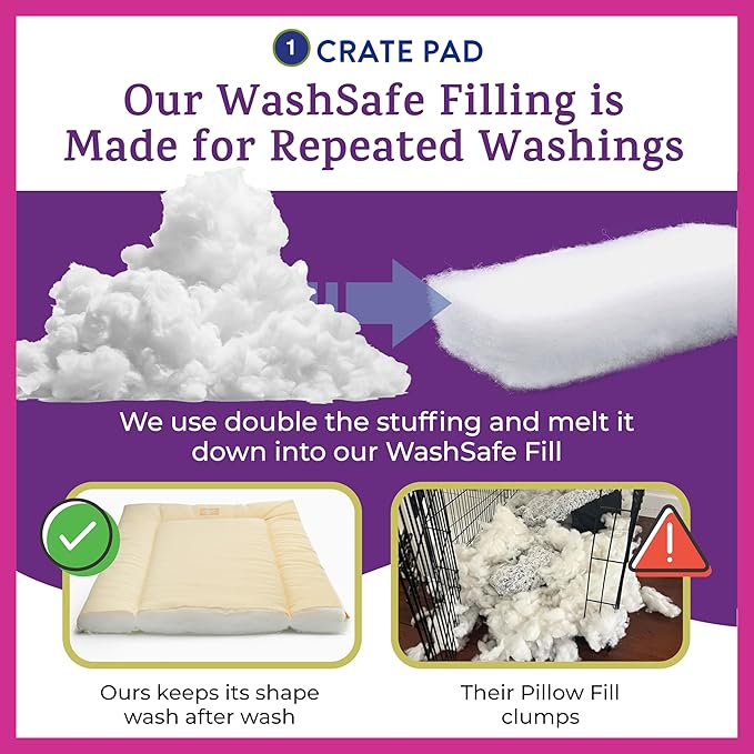 - 𝐏𝐫𝐞𝐦𝐢𝐮𝐦 𝐐𝐮𝐚𝐥𝐢𝐭𝐲: Invest in a Crate Set that's built to last. We don't cut corners, our Crate Bumpers are filled with extra dense fiber to protect your dog against the hard metal crate bars, they are up to 50 percent taller and thicker than other products with 9 Pieces of Velcro because ties come off easily. Our Crate Covers are made of real fabric not polyester coated in toxic PVC. Our Crate Pads are made for Unlimited Washes! Our special fill will never bunch up or get lumpy after washing compared to beds filled with loose fiber fill. We only use premium fabrics that don't pill, shed, or mat so they look new for years and are completely washable.