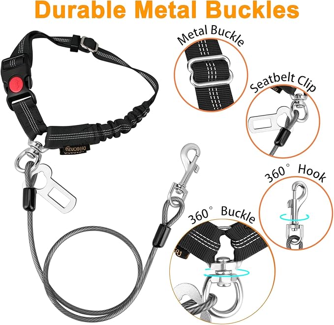 • HEAVY DUTY AND EASY TO USE --- This dog seat belts for large dogs is made of steel wire rope which Prevent dogs from chewing. The headrest loop is made of durable nylon with reflective strap and is fully adjustable to fit around the head rest of all vehicle models and trucks of all sizes. There are 3 metal accessories and 1 lockable plastic buckle in the dog safety belt for car. Two 360°rotation buckles prevents dog belt from getting tangled.