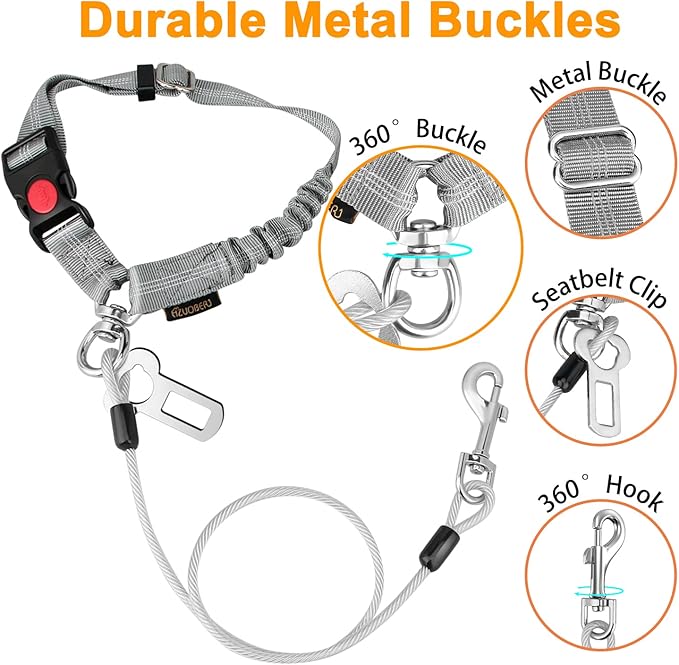 • ELASTIC FEATURES --- What is the most unique and practical design? I have to say that is combining the steel cable and elastic features onto the chew proof dog leash.Our dog car leash seat belt is designed with headrest restraint and clip. There are elastic bungees in it to make the leash shock-absorbent, effectively strengthening the protection of dogs from sudden stops or sharp turns.
