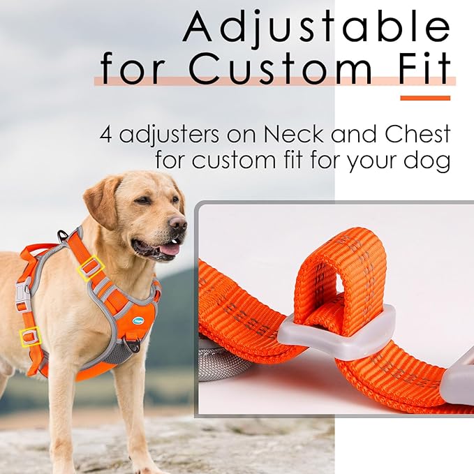 • DOG HARNESS WITH HANDLE: This dog vest harness comes with a wide handle on the back, which allows you to control the dog closely in emergency situations, such as when the dog is trying to pounce on someone, chasing other animals, or crossing the road. The flexible strap of our dog harness can prevent the dog from choking when pulled by humans, making the force evenly distributed.