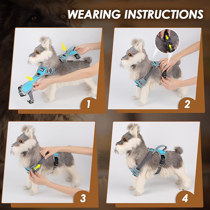• 【EASY TO WEAR】--- Simply sleeve in from the head and buckle up on both sides to wear the dog harness. 4 adjustable straps and 2 quick snap buckles make the heavy duty harness easier to put on and take off. Double locking buckles also strengthen security.
