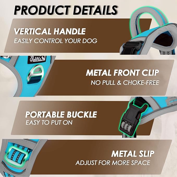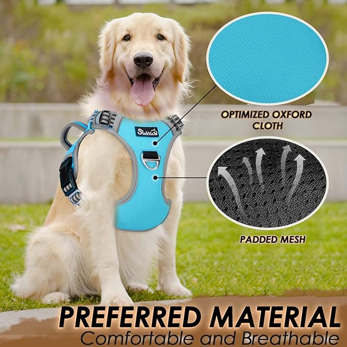 • 【HIGH-END MATERIAL】--- Made of 100% polyester, scratch-resistant Oxford mesh fabric and soft sponge, our large padded dog harness is lightweight, breathable, durable and skin-friendly. This easy walk harness will protect the spinal nerves of the dog and provide all day comfort for your pet friend.