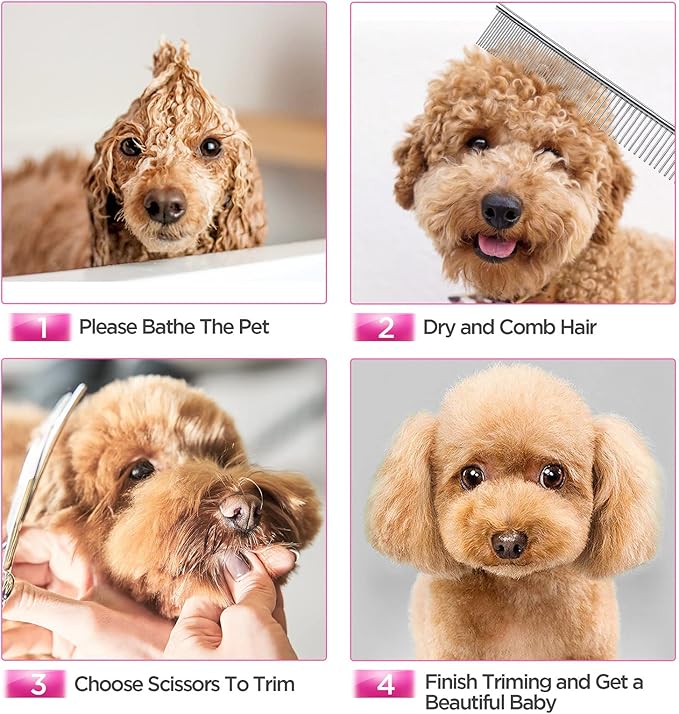 • 【5 in 1 Dog Grooming Scissors Set】The dog grooming scissors set comes with 1 straight scissors, 1 thinning scissor, 1 curved scissor, 1 grooming comb and 1 storage case