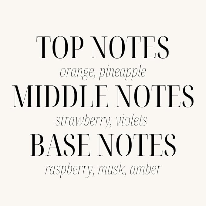 • Top notes: orange and pineapple, Middle notes: strawberry and violet, Base notes: raspberry, musk and amber
