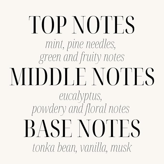 • Top notes: mint, pine needles, green and fruity, Middle notes: eucalyptus and floral, Base notes: Tonka bean, vanilla and musk
